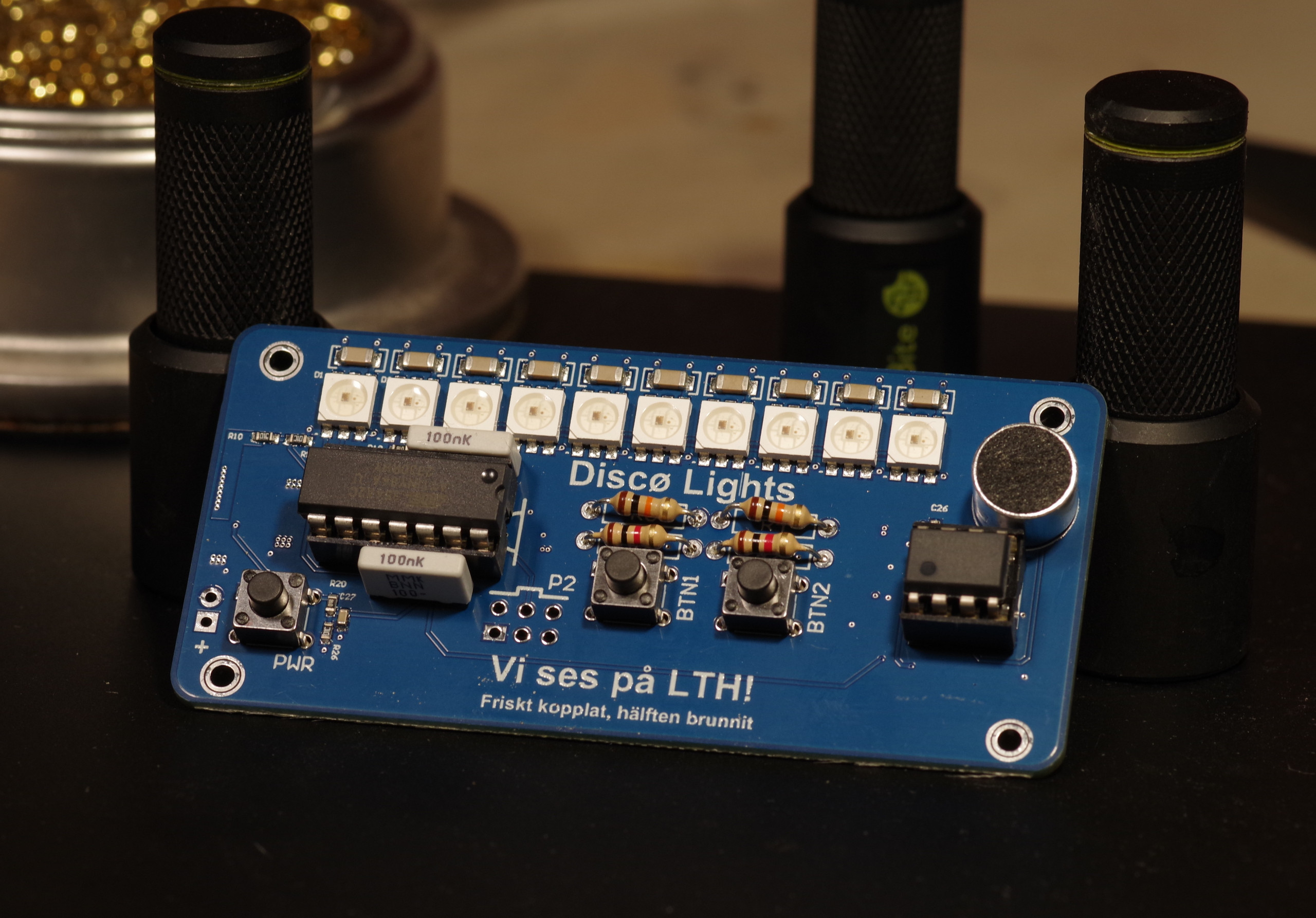 Blinkmojt är en gammal ETF tradition där LTH nollor fick bygga ihop ett, enkelt sagt, blinkande kretskort att förslagsvis pynta overallen med. Tyvärr så gick traditionen under jorden i flertalet år – tills 2025! Blinkmojt 2025, även kallad Discø Lights, är ny utgåva utrustad med tekniskt sett färre dioder än första utgåvan men med 16777215st fler färger, mikrofon och hela tre knappar! Med exempel-programmet laddat styr en Attiny-44A dioderna utefter den musik mikrofonen fångar upp. Den skickliga kan givetvis flasha om kortet efter eget behag, givet att det man önskar är under 4KB..